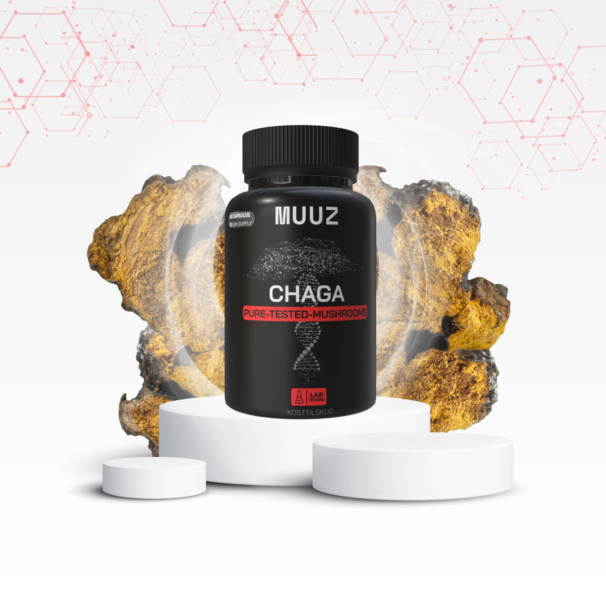 Chaga vokser på birketræer i kolde egne som Norden og Sibirien – og hos MUUZ forvandles den til standardiserede, laboratorietestede ekstrakter med dokumenteret renhed.